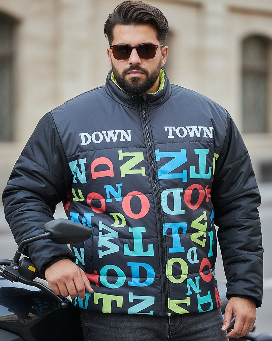 Men's Black & Blue Bate Typography Oversized Plus Size Puffer Jacket