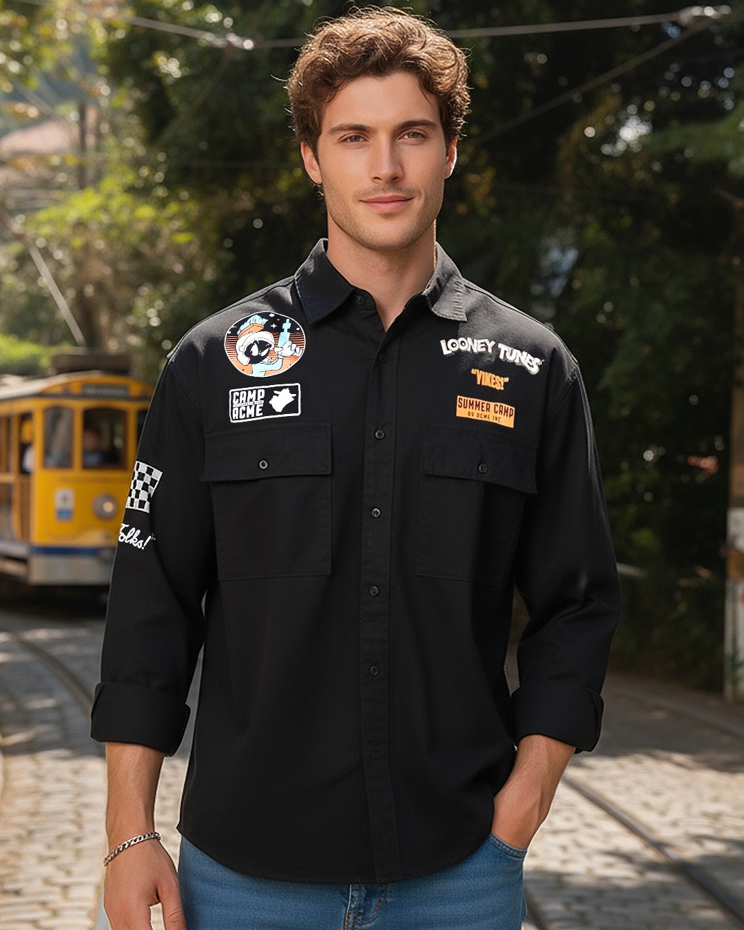 Men's Black Looney Tunes Graphic Printed Oversized Shacket