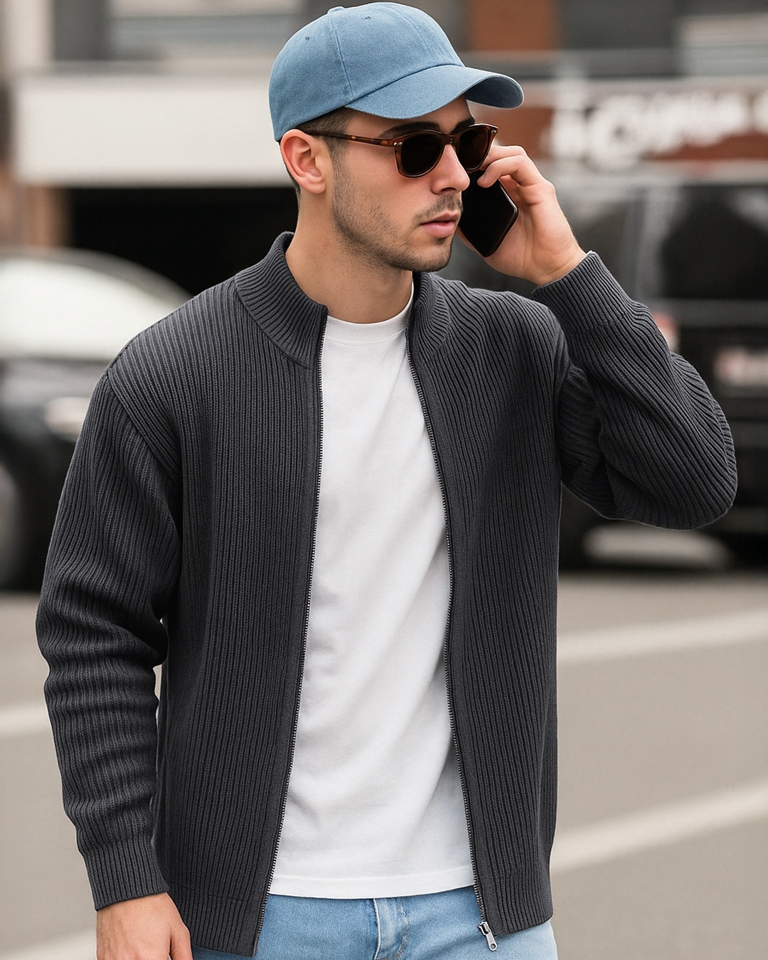 Men's Black Textured Oversized Acid Wash Zipper Sweater