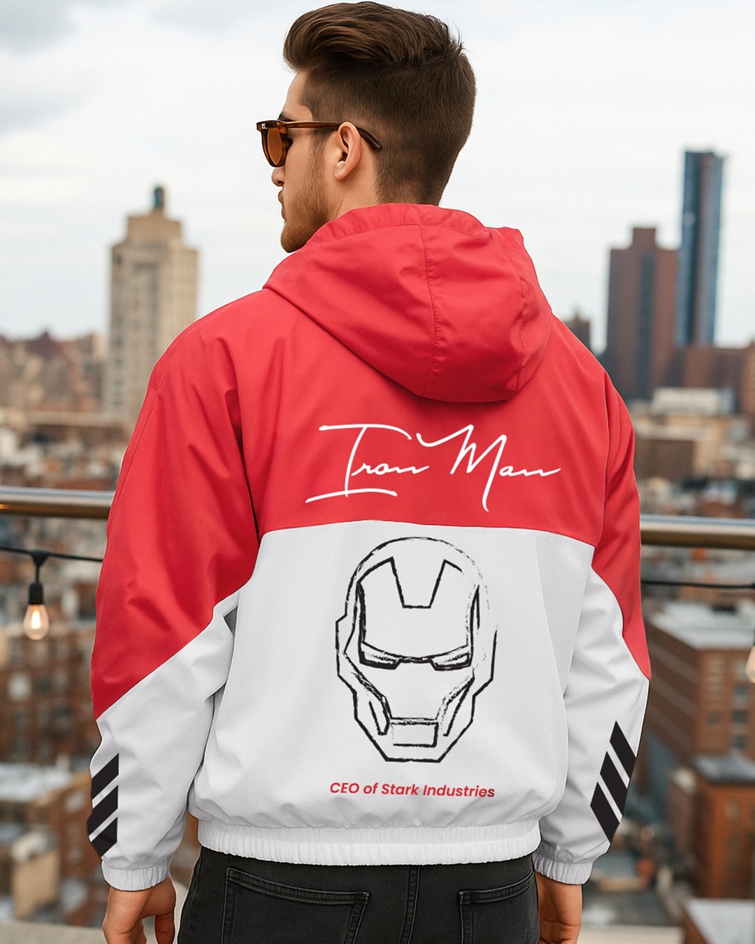Men's White & Red Iron Man Graphic Printed Oversized Windcheater Jacket