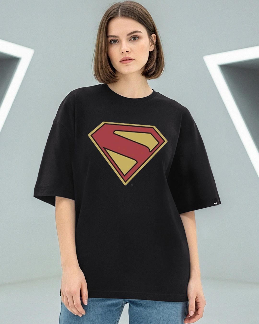 Women's Jet Black Superman Logo Graphic Printed Oversized T-shirt