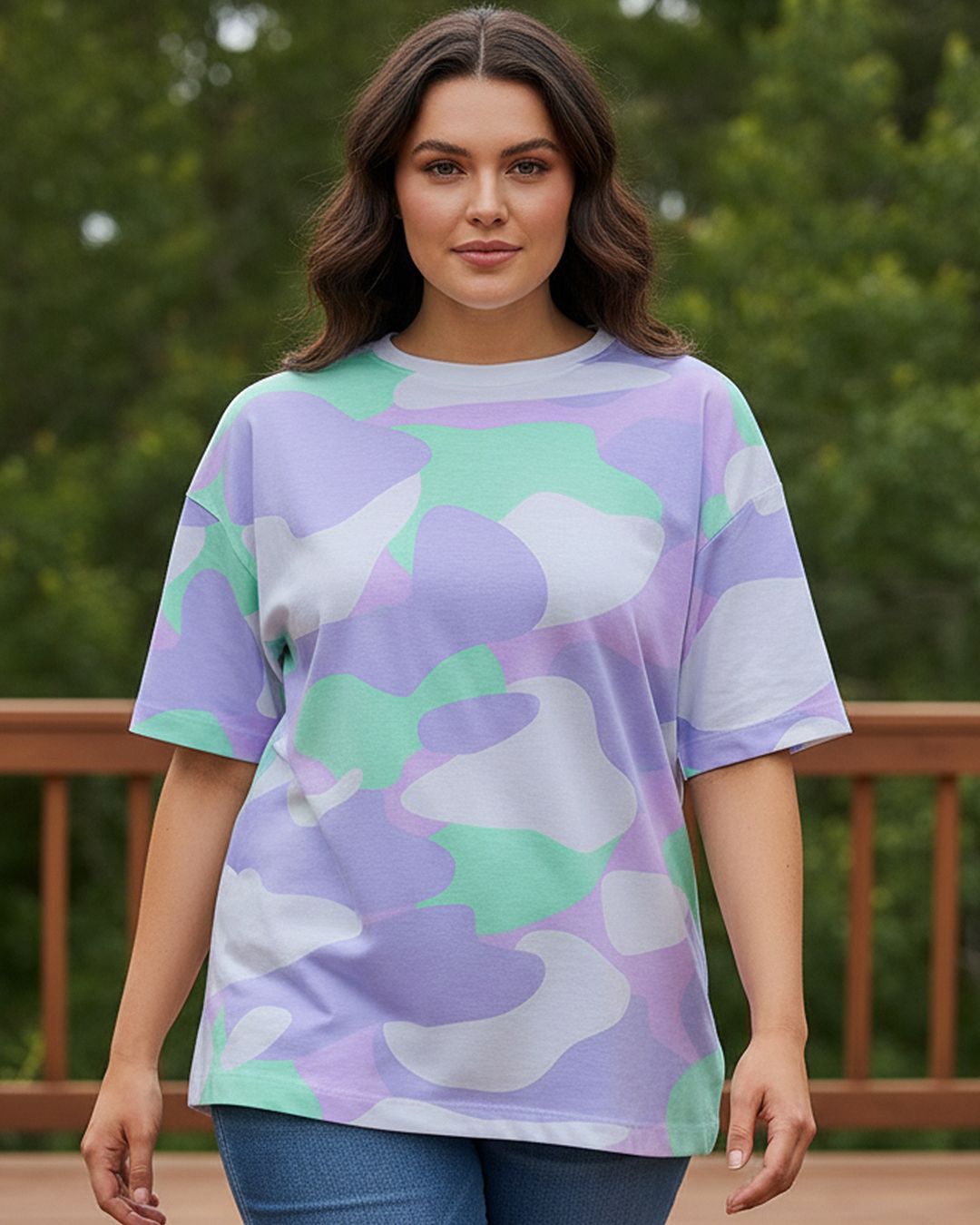 Women's White & Purple Camouflage Printed Oversized Plus Size T-shirt